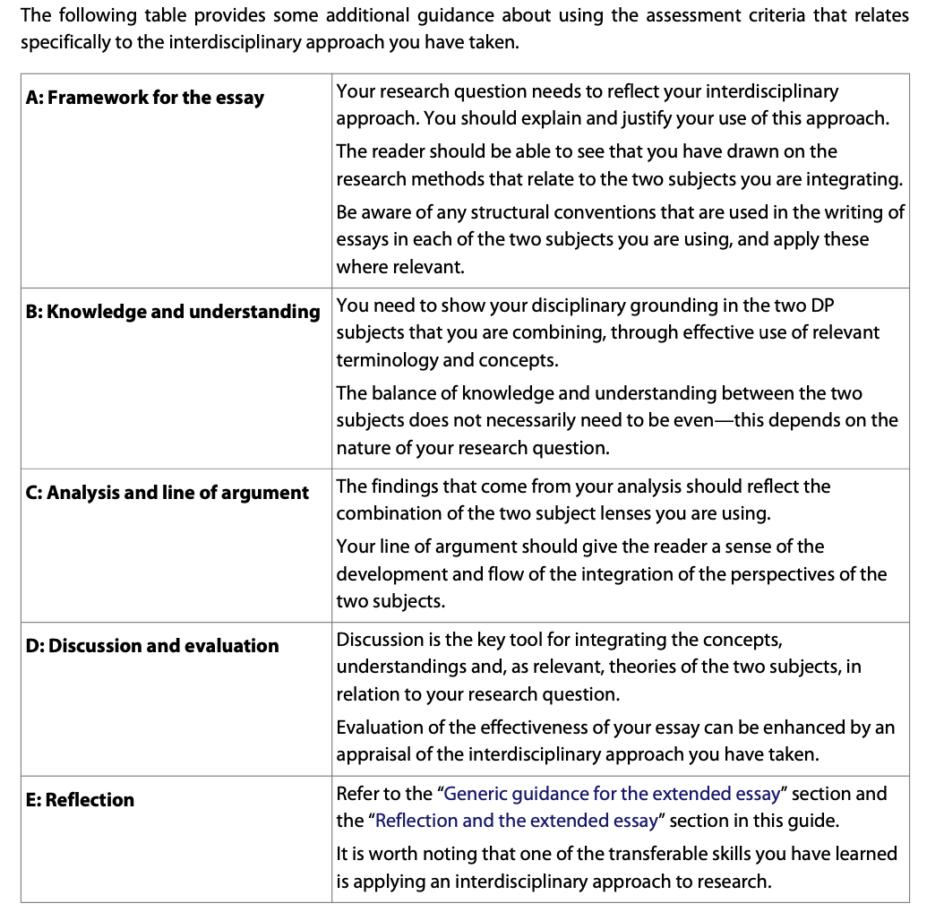 Criteria A, B, C, and D are used to grade your whole extended essay. Criterion E is only used to grade your reflective statement on your Research Planning Form (RPF).